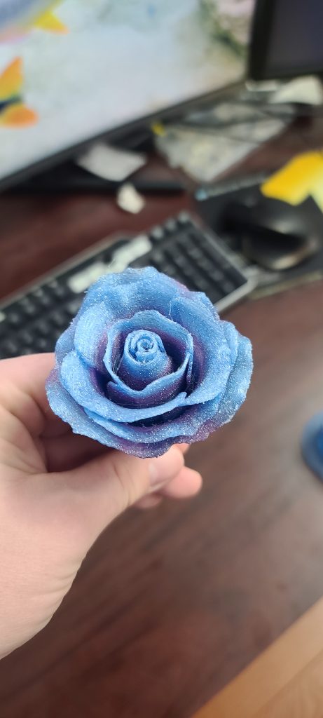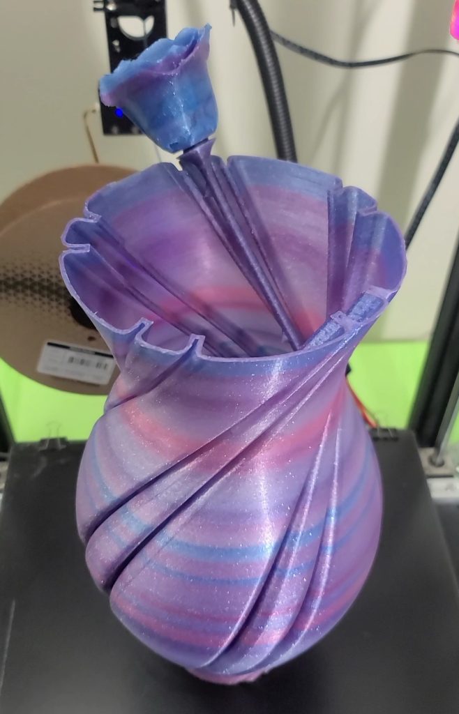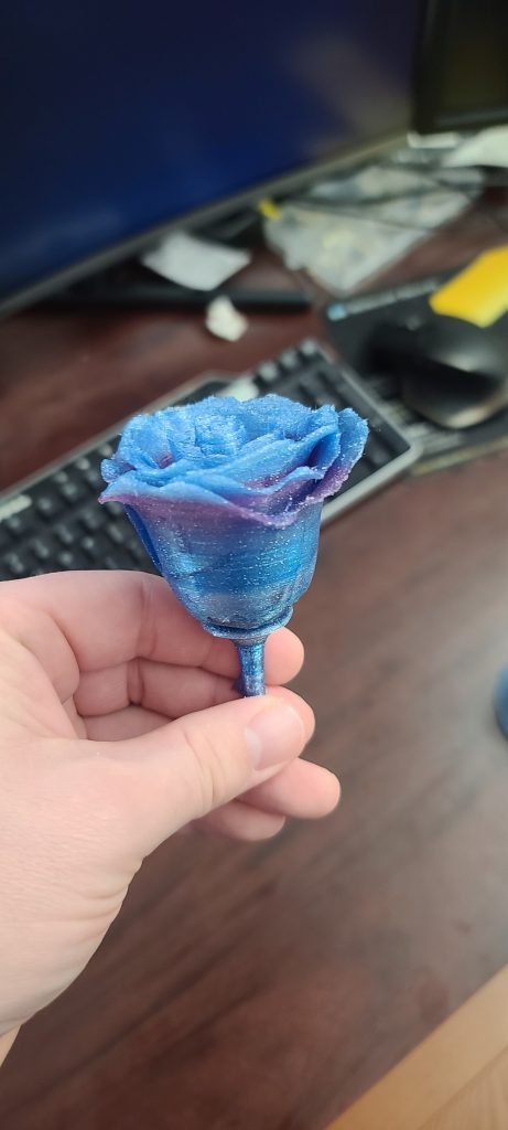 So one of the great things about having a 3d Printer is the ability to tell a friend they can have anything they want for their birthday as long as they can find an STL and it fits on my printer. So she tells me she wants a vase and likes purple. So I hope on to Thingiverse and find this Spiral vase by Streetfire_Industries on Thingiverse: https://www.thingiverse.com/thing:2421704 and text it to her. She tells me it is beautiful so I know it is a good choice. Some filament is left over so I printed a rose for fun but stretching it out so it was big enough made the stem print fail twice.
